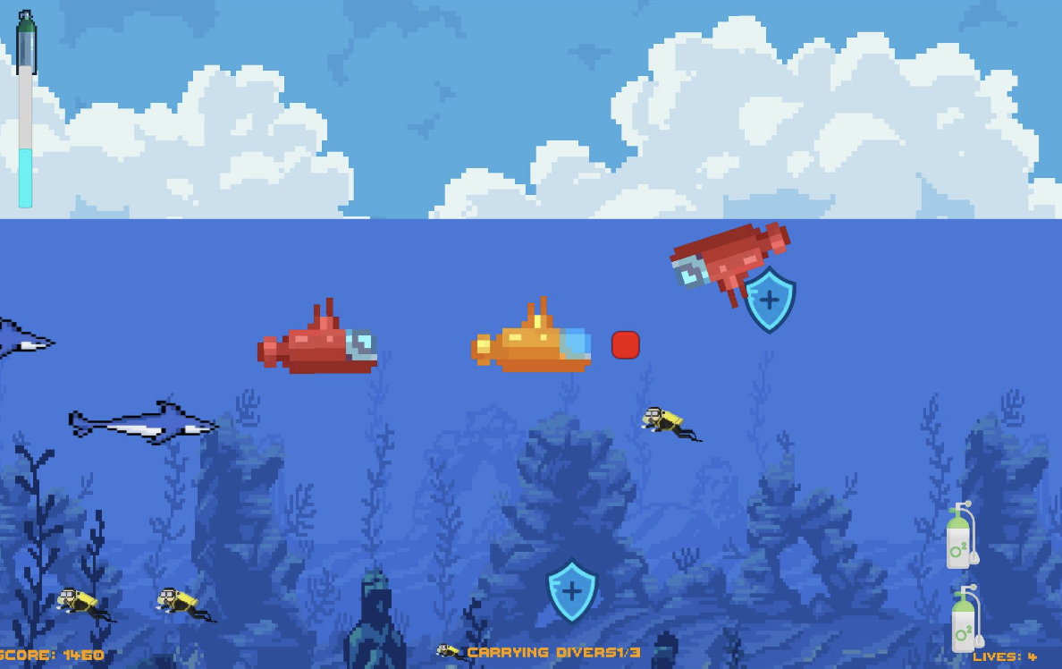 In RescuSub, players must navigate their submarine underwater to rescue divers while shooting enemy subs and avoiding oncoming sharks. Do your best to rescue divers and fight off underwater threats before your submarine oxygen levels run out by collecting oxygen and shield Power-ups!
